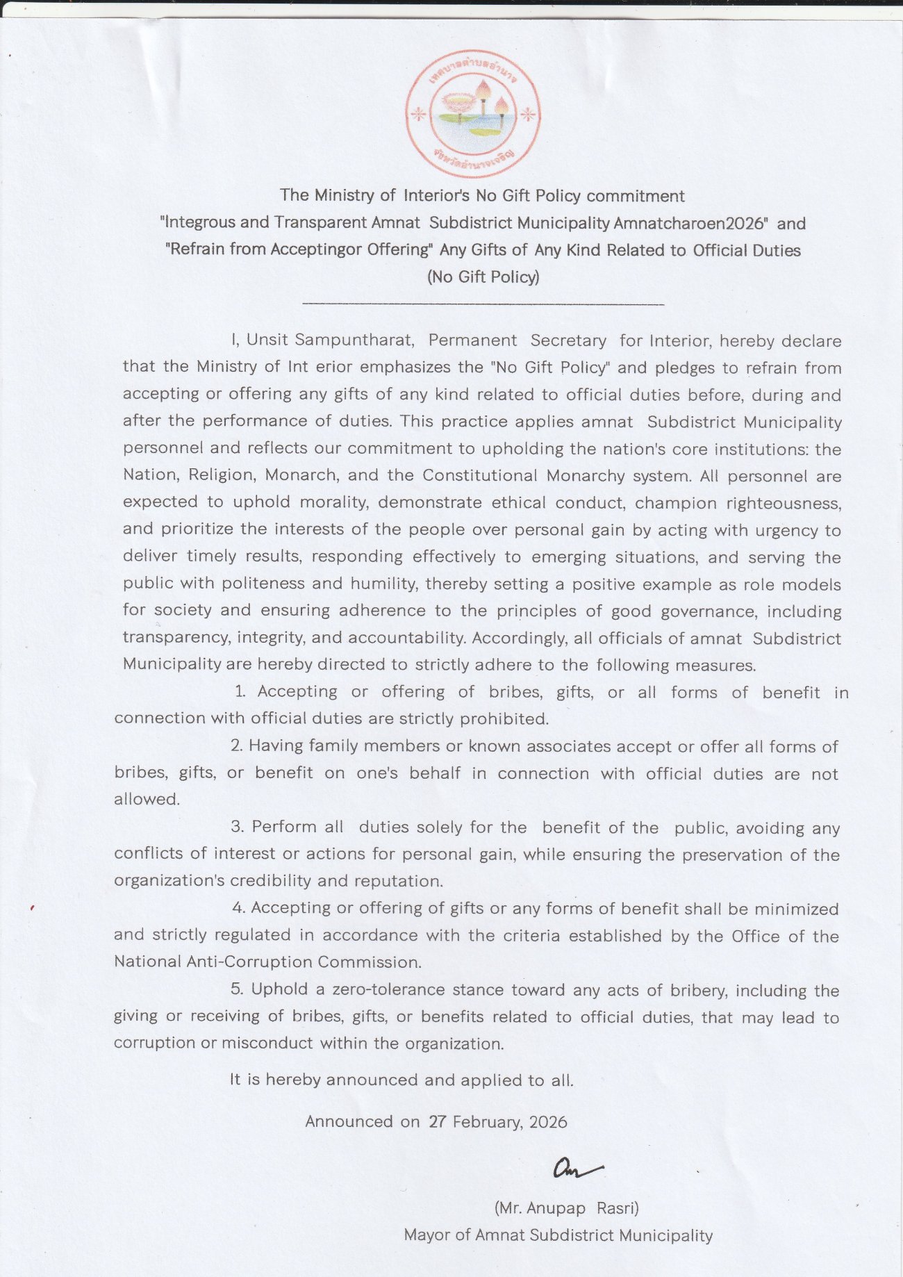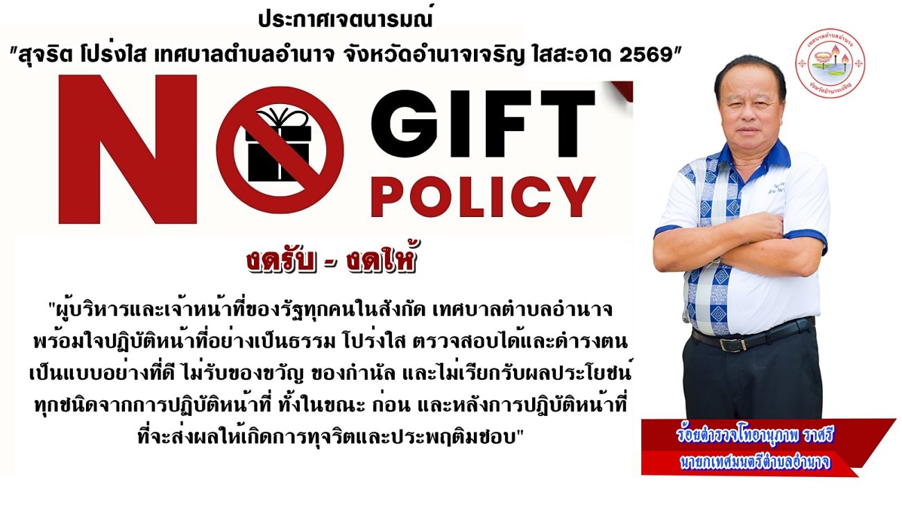 ประกาศเจตนารมณ์ เรื่อง "สุจริต โปร่งใส เทศบาลตำบลอำนาจ จังหวัดอำนาจเจริญ ใสสะอาด 2569" และ "งดรับ งดให้" ของขวัญ ของกำนัลทุกชนิดจากการปฏิบัติหน้าที่(์No Gift Policy