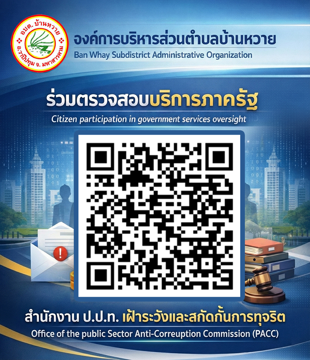 ประชาสัมพันธ์ QR Code สำนักงาน ป.ป.ท. เฝ้าระวังและสกัดกั้นการทุจริต ร่วมตรวจสอบบริการภาครัฐ องค์การบริหารส่วนตำบลบ้านหวาย