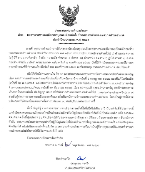 ประกาศเทศบาลตำบลอำนาจ เรื่อง ผลการสรรหาและเลือกสรรบุคคลเพื่อแต่งตั้งเป็นพนักงานจ้างของเทศบาลตำบลอำนาจ ประจำปีงบประมาณ พ.ศ.2569