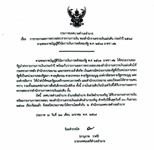 ประกาศเทศบบาลตำบลอำนาจ เรื่องการรายงานผลการตรวจสอบรายงานการเงิน ของสำนักงานตรวจเงินแผ่นดิน ประจำปี 2568